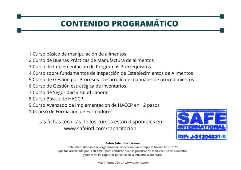 Nuestro programa contempla un amplia gama de cursos que abarcan desde los fundamentos de la manipulación de alimentos (único acreditado en línea en Venezuela) hasta temas avanzados como el HACCP y la gestión de riesgos.